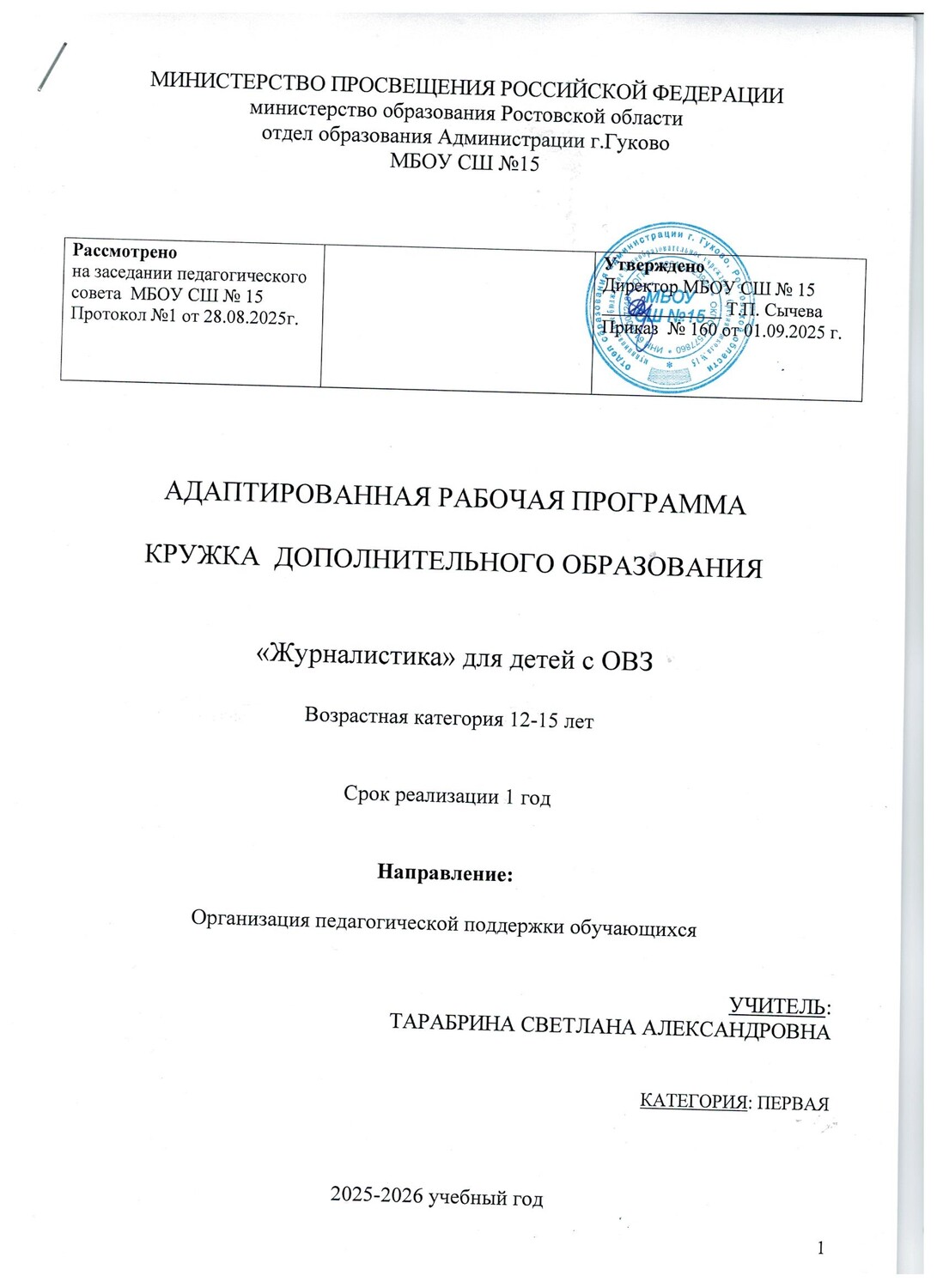 АДАПТИРОВАННАЯ РАБОЧАЯ ПРОГРАММА КРУЖКА ДОПОЛНИТЕЛЬНОГО ОБРАЗОВАНИЯ «Журналистика» для детей с ОВЗ возрастная категория 12-15 лет