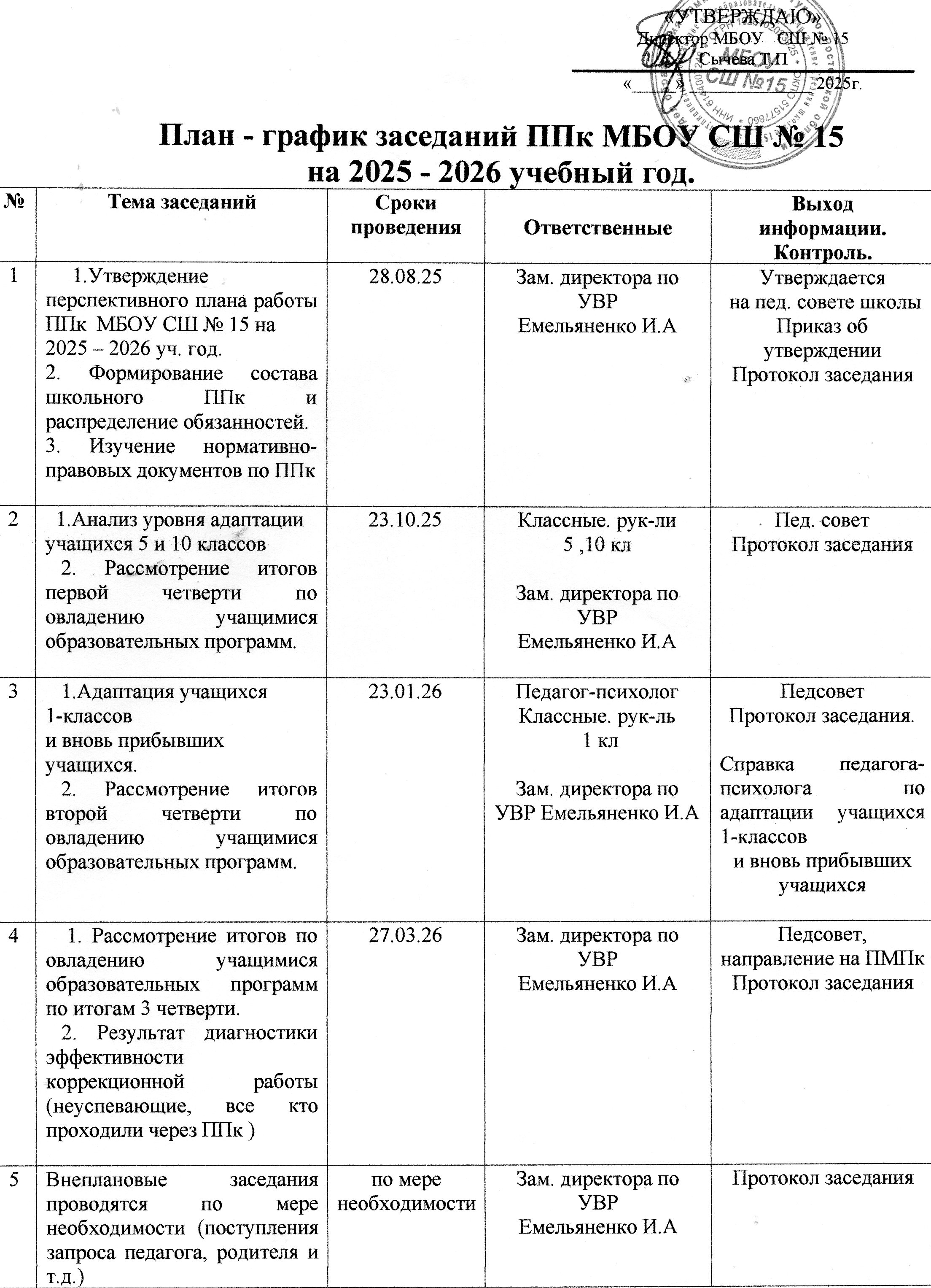 - План – график заседаний ППк МБОУ СШ №15 на 2025-2026 учебный год.