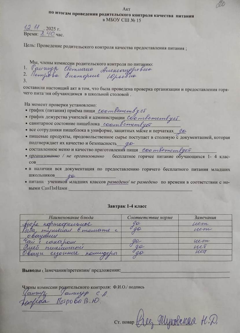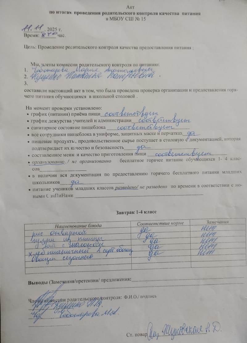 Акт по итогам проведения родительского контроля питания от 11.11.2025