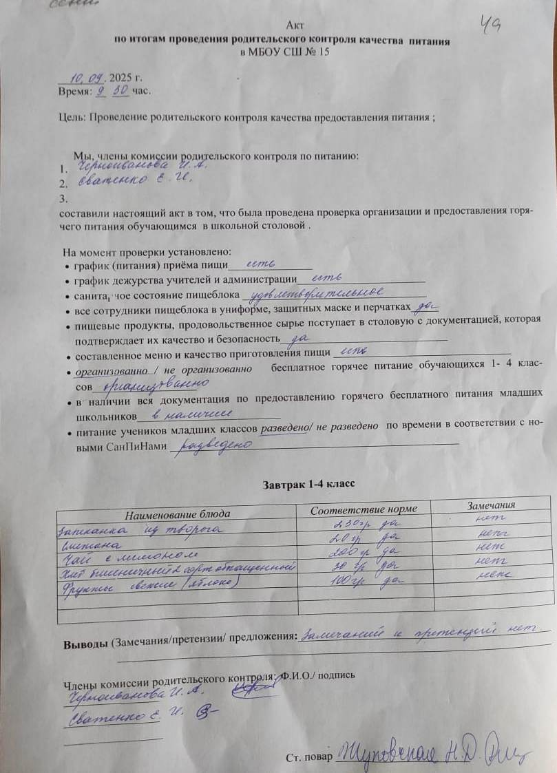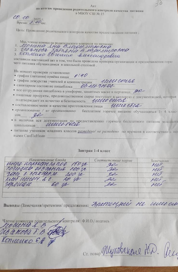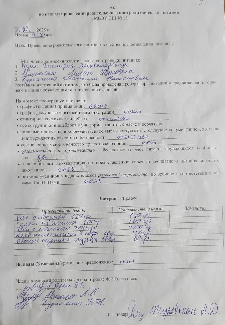 Акт по итогам проведения родительского контроля питания от 15.10.2024