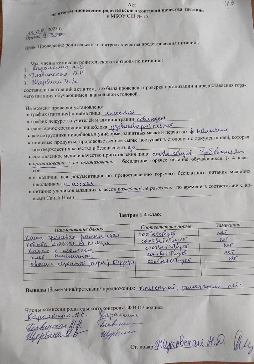 Акт по итогам проведения родительского контроля питания от 11.09.2025